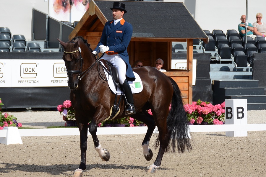 Gisteren won de ruiter in Roosendaal al met een percentage van 73.500% de Grand Prix. Vandaag mocht Tommie Visser met Variohipique’s Vingino (v. Polansky) in de dressuurpiste hun kür op muziek laten zien. Vooral de pirouette naar links scoorde hoog en werd met negens beloond. Hoewel de jury niet anoniem was, bleek de totaalscore van de combinatie meer dan voldoende om de overwinning op naam te kunnen schrijven. Op zijn Facebook account schrijft Tommie Visser: ‘WoW 77.25% wat was ’t spannend!!!