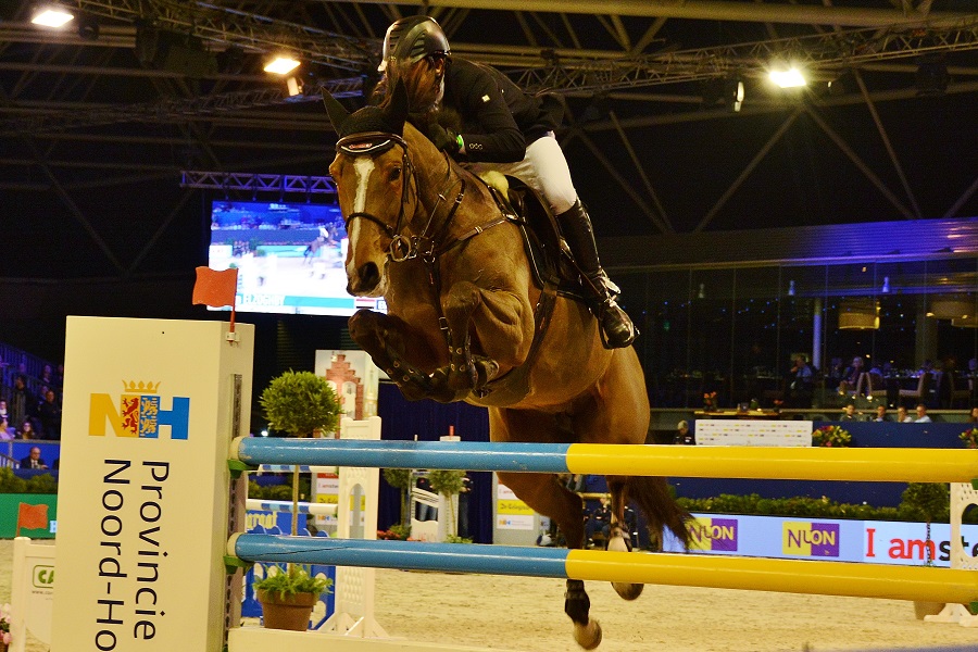 Amsterdam – Met zesenveertig internationale combinaties ging de tweefasen wedstrijd op tijd, met een hoogte van 1.45m,, voortvarend van start. Michael Greeve zette als achttiende starter met Eurohill’s Africa een hele scherpe tijd neer van 24.69s. Hij bleef hiermee een hele tijd aan de leiding ondanks verwoede pogingen van de concurrentie.