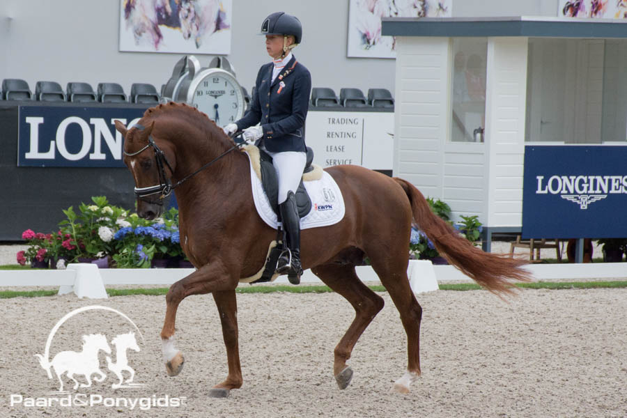 Het was uiteindelijk Kirsten Brouwer die met de Amazing Star zoon Five Star Veronique Roerink en Flanell van de koppositie wist te verdrijven. De KWPN hengst liet zich goed zien onder het zadel van zijn amazone en behaalde een totaal percentage van 87 procent, waarbij de galop met een 8.9 het hoogst werd beoordeeld. Met de overname van de koppositie zag het voorlopige podium er, met nog dertien combinaties te gaan, vooralsnog behoorlijk Nederlands uit.