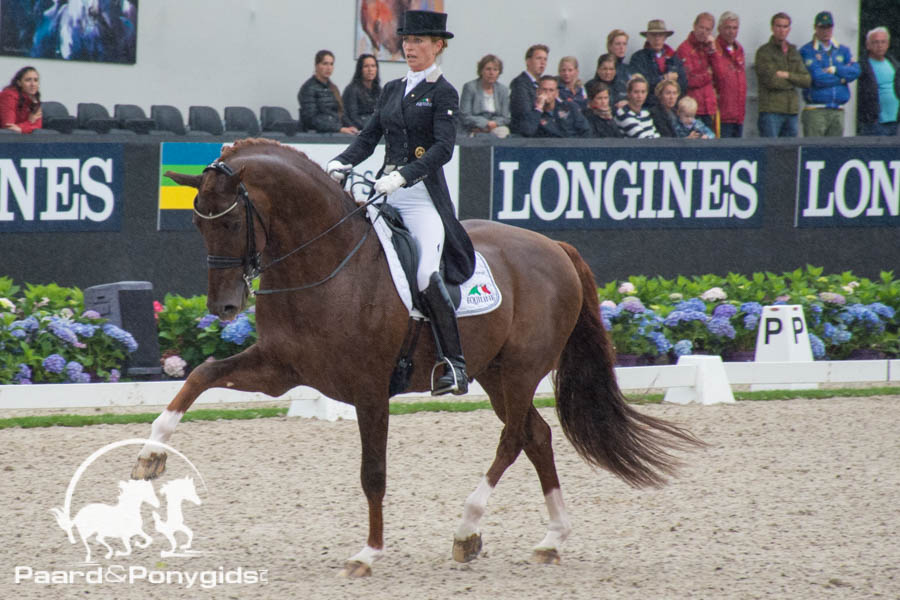 De Belgische amazone Katrien Verreet wist met de eveneens 9-jarige hengst Bailamos Biolley (v. Sir Donnerhall) beslag te leggen op de tweede plaats met een score van 74.458 procent. De jury was niet unaniem in haar oordeel. Een jurylid vond de proef een eerste plaats waard en een ander jurylid zag er meer een derde plaats in, gemiddeld kwamen ze echter toch uit op die tweede plaats.