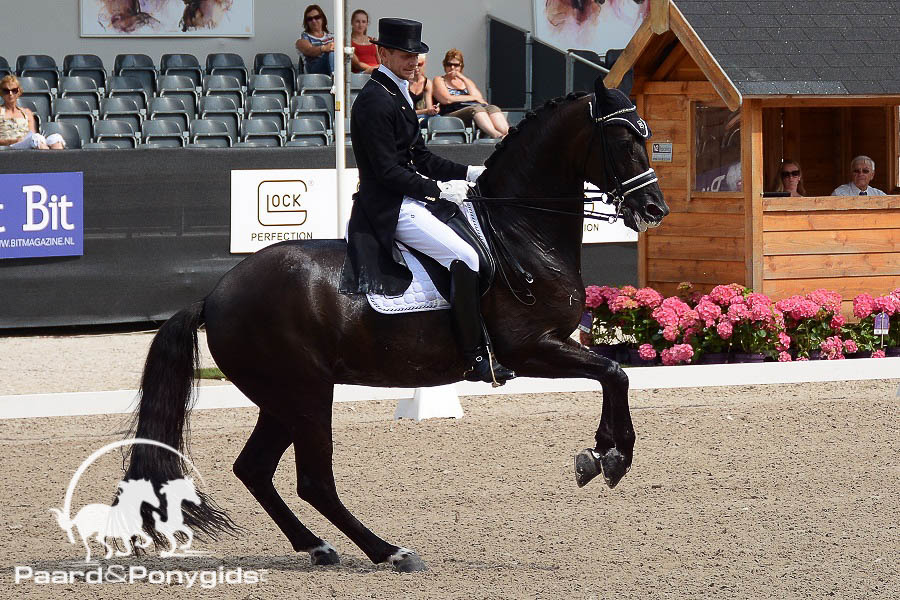 Rond kwart voor negen verscheen de tweede Nederlandse combinatie in de ring. De focus was van het gezicht van Edward Gal af te lezen toen hij zijn Glock’s Voice (v. De Niro) de piste liet binnen galopperen. De combinatie liet een voorzichtige maar gecontroleerde proef zien. Met de toegekende 75.271 procent neemt Edward Gal in het tussenklassement een voorlopige vierde plaats in. De Britse Fiona Bigwood staat met Orthilia op een voorlopig derde plaats met 77.157 procent.