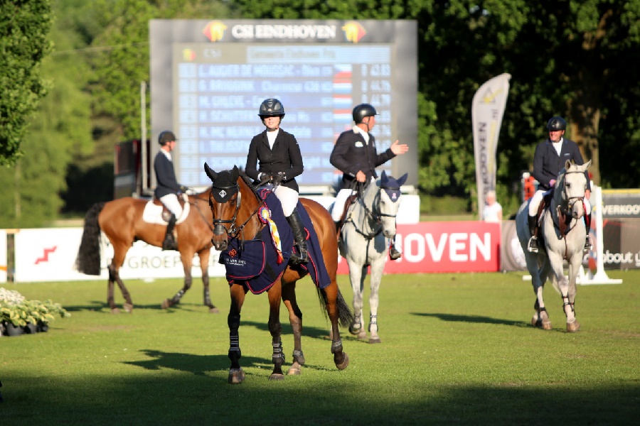 Alle credits verwijst Emma Augier de Mousac naar haar merrie. “Ik kwam echt niet steeds mooi bij de hindernis, maar ze sprong haar hart eruit. Ik won dit jaar in Spanje al een 1.50m proef met haar, werd keer tweede in een 1.60m Grote Prijs en nu dit. Ze doet het zo makkelijk en ze is zo rijdbaar. Ook leuk: haar fokker (P. Knijnenburg uit Deurne, red.) was hier. Ik heb hem mijn fles champagne gegeven.”
