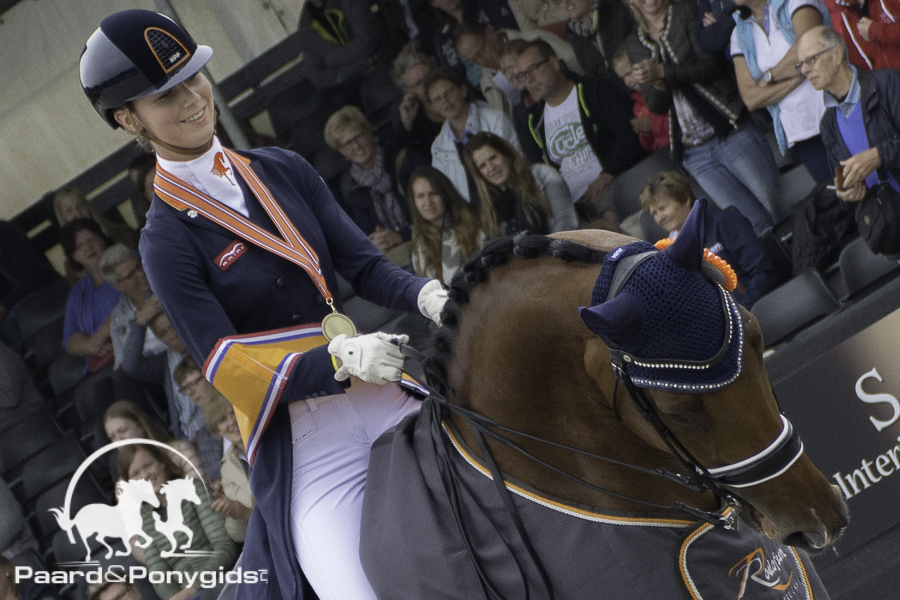 Van Peperstraten mikt dit jaar nog wel op deelname aan het EK Junioren, maar besloot om vast een iets hogere moeilijkheidsgraad aan te boren. Haar Greenpoint’s Cupido toonde ook de op dit niveau gevraagd oefeningen met ogenschijnlijk gemak.