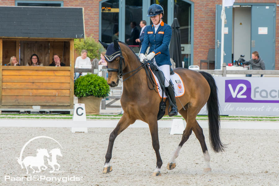 Nadat Sanne Voets gisteren al een nieuw persoonlijk record mocht noteren, deed de combinatie er vandaag in de kür nog een schepje bovenop en met succes. Na de kür verscheen er maar liefst 81.417 procent op het scorebord. Onder andere voor de galop overgangen pronkten er negens op het protocol van de meervoudig Nederlands Kampioene. Lotte Krijnsen werd met Rosenstolz tweede met 73.584 procent en Maud Haarhuis stuurde Baron naar een vijfde plaats in het klassement.