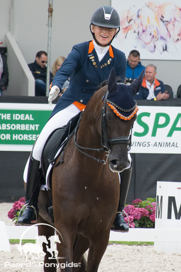 “Niet normaal!”, reageert Kimberly Pap. “Het zilver in de individuele proef was al top, maar vandaag was het toch een nieuwe dag. Het is wel heel gaaf dat het zo uitpakt. Eigenlijk liep Vloet Victory heel goed in de kür. Het drafgedeelte was heel mooi en in de staponderdelen ging het ook vlekkeloos. In de galoptour ontstond helaas tot twee keer toe een fout in de serie om de drie. Ik had niet verwacht dat ik met zo’n grote fout alsnog mee kon doen om de medailles. Na afloop stond ik op zilver en toen moest er nog één. Het maakte ook niet uit, want ik was vooral heel blij.