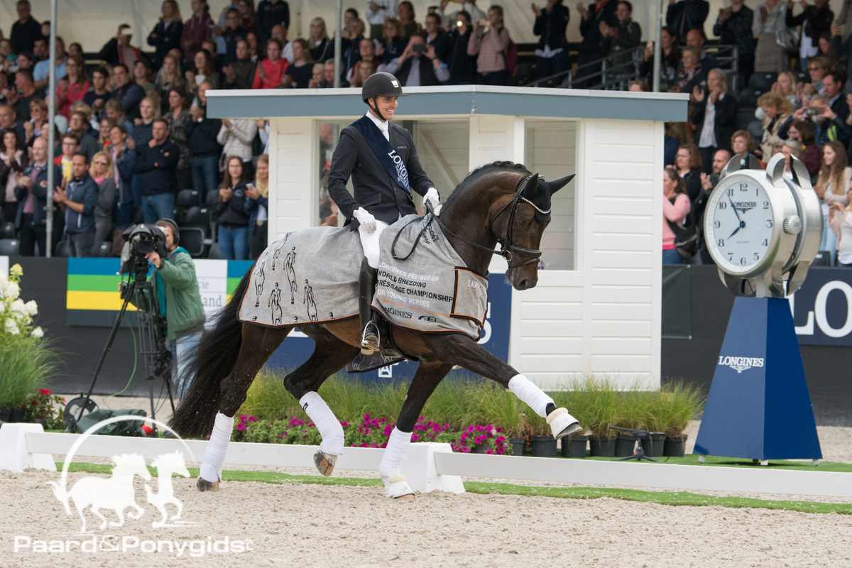 “Voor de stap geven we een 8.3 en verder worden het allemaal tienen”. Dat waren, na rijp beraad, de woorden van de jury na afloop van de proef van de vijfjarige KWPN hengst Jovian. Daarmee kwam de wereldtitel bij de vijfjarigen in handen van de Apache x Tango zoo