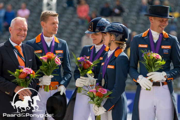 Een prachtige proef van Patrik Kittel sloot de strijd voor Zweden af en met een score van 78.261 passeerden de Zweden Denemarken. Tegelijkertijd legden ze het vuur aan de schenen bij de Nederlanders en dan vooral bij Edward Gal. Die moest namelijk als laatste de ring in en kreeg kort voor die tijd tijdens het losrijden te maken met de hengstenstreken van Zonik. De hengst werd in de losrijdring afgeleid door maar liefst drie knappe merries en zag deze, zeer tegen zijn zin, één voor één vertrekken richting de wedstrijdring. Daarmee werd het losrijden voor Edward Gal een ware opgave. Bij het inrijden van de piste leek de ruiter zijn handen ook vol te hebben aan de zwarte hengst, maar eenmaal aan het werk gezet wist Gal Zonik goed bij de les te houden. Zonder fouten te maken reed de combinatie sterk door de proef en eindigde een fractie hoger dan Patrik Kittel. Daarmee had Nederland het brons in handen en leek het podium compleet.