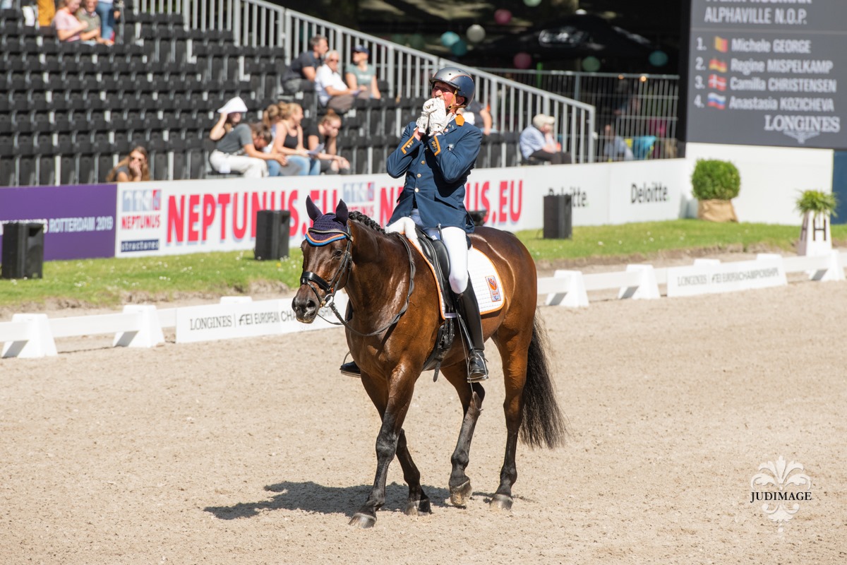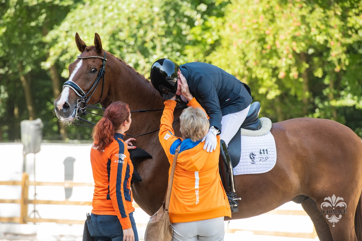 Vanmorgen wist Sanne Voets haar favorietenrol waar te maken door met Demantur RS2 N.O.P. naar de hoogste score te rijden in de individuele proef van de Grade IV. De amazone nam daarmee krap drie procent afstand van de nummer twee in het klassement. Na de proef reageerde de amazone geëmotioneerd op haar overwinning met haar toppaard Demantur en kon een traantje van blijdschap niet meer onderdrukken. De Belgische Manon Claes nam het zilver in ontvangst en brons was er voor de Zweedse Louise Etzner Jakobsson.