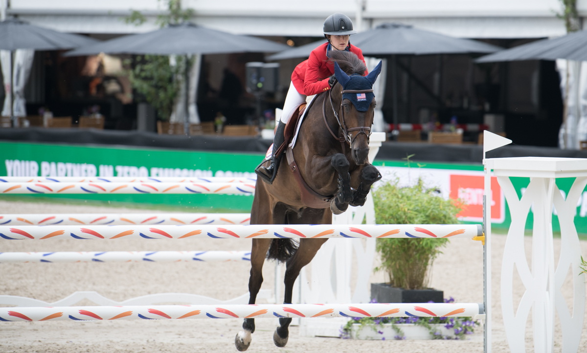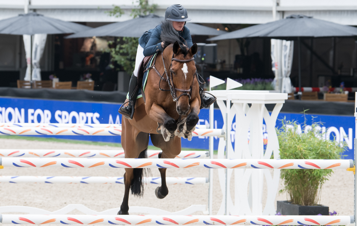De openingsrubriek op deze vrijdag van het CHIO Rotterdam is zojuist gewonnen door de Amerikaanse amazone Lucy Deslauriers. Sanne Thijssen werd met Genasis tweede.